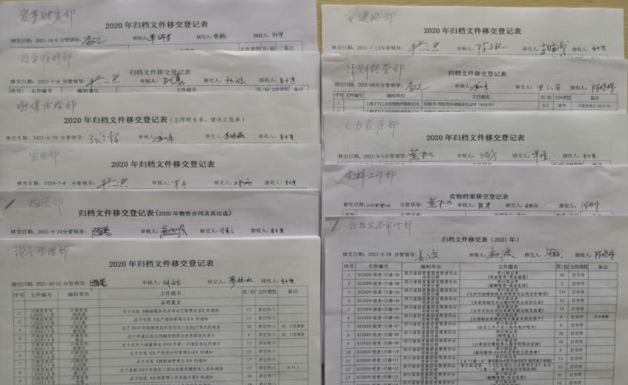 为及时收集、整理、保护公司生产经营中产生的文件和重要资料,按照公司《档案管理标准》要求,2021年2月至11月,公司按计划开展了2020年度档案移交工作。同时,为确保档案移交工作保质保量按期完成,公司各部门按时收集、分类整理,在规定移交时限内分批完成了2020年度应归档文件移交工作;各分管领导高度重视、认真审核,确保了各部门移交归档文件的及时性和完整性。